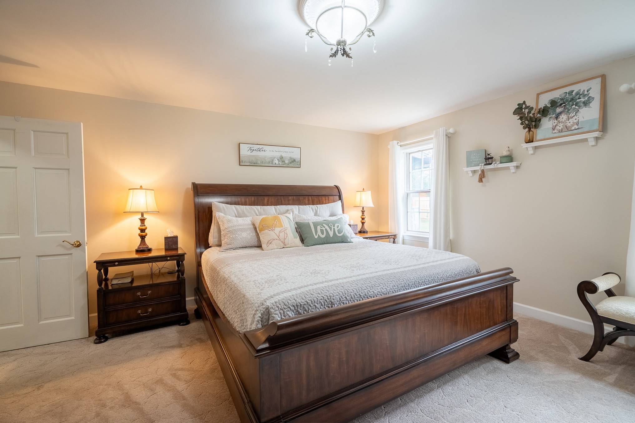 The outside has a great mix of stone and brick, and inside you'll find custom stained-glass windows plus a living room beam and mantel built from barn wood that came from the neighborhood. The floor plan includes a formal dining room, a well-equipped kitchen, and a bright sunroom that looks out over raised, self-watering garden beds and a separate fenced vegetable garden. The kitchen has white cabinets and newer appliances that stay with the home, giving it a clean, classic look.